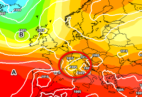 Si nota chiaramente “l’ammaccatura” nel tessuto anticiclonico che ospiterà condizioni di instabilità specie al nord e su parte delle regioni centrali; l’alta pressione africana si ritirerà verso sud, mentre l’anticiclone delle Azzorre starà “di quinta” sul vicino Atlantico.