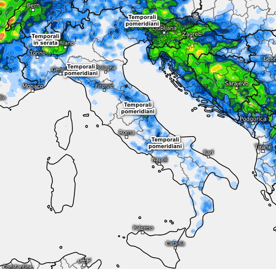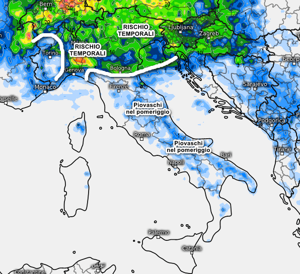 Secondo alcune mappe, non tutte, potrebbe esserci un passaggio temporalesco anche corposo su gran parte delle regioni settentrionali, anche se la previsione risulta ancora in forse e passibile di cambiamenti. Qualche rovescio o temporale pomeridiano si farà vedere anche lungo la dorsale appenninica, con basso rischio di sconfinamenti lungo le coste, per il resto tempo stabile, soleggiato, ma leggermente meno caldo.