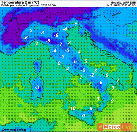 Punte al ribasso di -6° sulla Pianura Padano-Veneta e il basso Piemonte, -7° sull’Appennino settentrionale. Molto freddo anche nelle aree interne del centro-sud con punte di -6° nelle vallate incassate in occasione di cielo sereno e calma di vento.