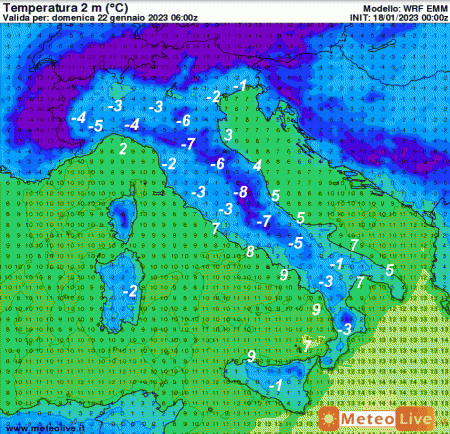 Punte di -7/-8 nelle aree interne dell’Appennino centrale, -6° sulla Pianura Padano Veneta, -5° sul basso Piemonte, -2° nelle aree interne della Sardegna e -1° in quelle della Sicilia.