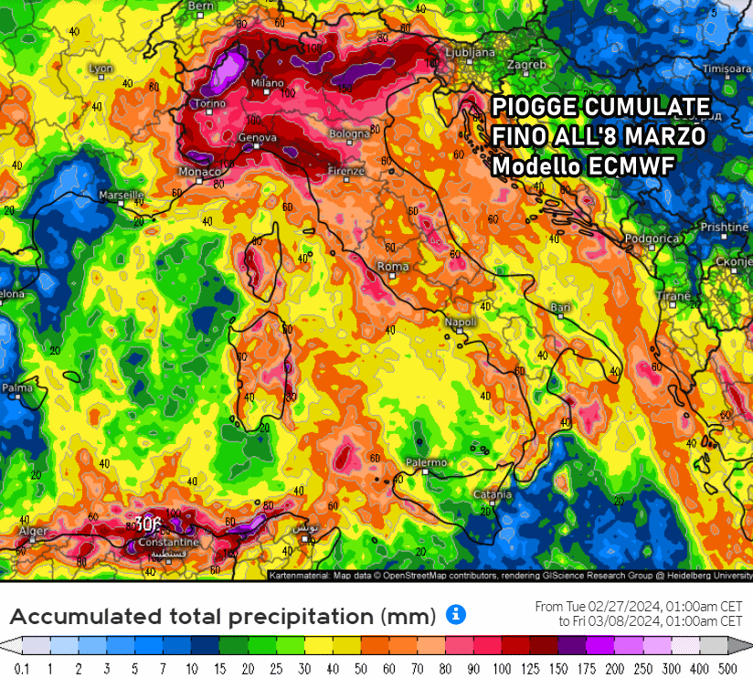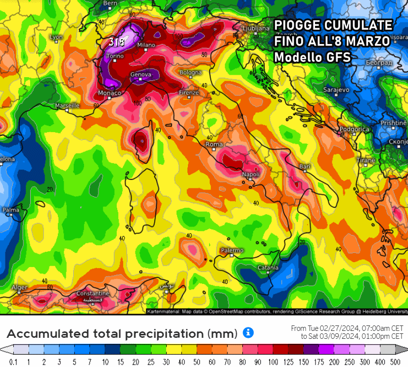 Il modello americano GFS è il più generoso in termini di accumuli pluviometrici, specie sul Nord-ovest dove spiccano punte di oltre 300 mm a ridosso dei monti. Questi valori si riferiscono alle piogge totali previste fino all’8 marzo, escluse le piogge già cadute nelle scorse ore.