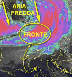 Questa volta l’aria fredda, che vedete in alto a sinistra, troverà il modo di aggirare l’arco alpino. Una parte se ne andrà verso levante, senza interessarci; la porzione di freddo che a noi interessa scivolerà abbastanza speditamente verso la Francia orientale, penetrando nel Mediterraneo dalla Valle del Rodano ( freccia gialla sottile).