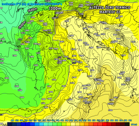 Dalla mappa si evince lo zero termico previsto martedì fino a 1300-1500 metri sull’arco alpino: