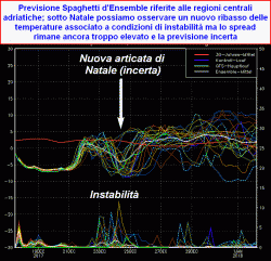 Sin qui tutto coerente, se non fosse che il nuovo aggiornamento del modello europeo smentisce clamorosamente questa ipotesi a favore dell’anticiclone e con esso valori termici più miti. D’altro canto non ci vengono in aiuto nemmeno le medie Ensemble degli spaghetti, le quali mettono in luce proprio sotto Natale, uno spread ancora troppo ampio.