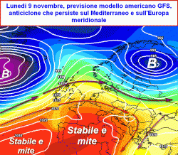 Soprattutto dalla seconda decade di novembre quindi, la circolazione atmosferica a livello italiano tenderà a provenire dai quadranti occidentali, alcune delle nostre regioni potrebbero pertanto essere coinvolte da addensamenti nuvolosi di passaggio che risulterebbero più consistenti ed intensi lungo i versanti tirrenici. Le temperature resterebbero attestate su valori molto miti, attualmente il centro di calcolo americano stima un profilo termico attestato ai +10°C alla quota di 850hpa.