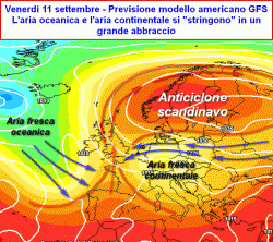 In seguito verrebbe infranto questo effimero legame dell’alta pressione con le masse d’aria più calde appartenenti alle fasce subtropicali, lo step successivo sarebbe quindi la formazione di un vasto "cut-off" anticiclonico in posizione anomala a cavallo tra il Regno Unito e la Penisola Scandinava. L’Italia sperimenterebbe dapprima una circolazione nord-orientale di venti che porterebbe fenomeni di instabilità al centro ed al sud, con temperature inferiori alla norma soprattutto al nord. (mercoledì 9 – venerdì 11 settembre)