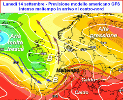 In seguito l’alta pressione ruoterebbe ulteriormente sul proprio asse, collocandosi in una posizione intermedia tra la Penisola Scandinava e l’est Europa. Questa manovra interromperebbe il flusso di correnti fresche ed instabili da nord-est sull’Italia, consentendo l’aggancio di una vistosa circolazione ciclonica di origine atlantica. L’aria più fredda di origine continentale affluita i giorni immediatamente precedenti, consoliderebbe una vasta anomalia negativa di temperatura e geopotenziale sul Mediterraneo, anomalia che verrebbe sfruttata dalla depressione oceanica per portarsi senza troppe difficoltà a ridosso dell’Italia. Ne deriverebbe una fase di intenso maltempo indirizzata alle regioni settentrionali con possibilità di piogge anche copiose. La ventilazione sarebbe attiva di Scirocco su tutto lo stivale. (domenica 13 – lunedì 14 settembre).