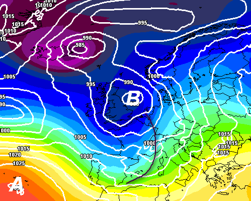 Per la fine dell’anno tuttavia alcuni modelli (non tutti) prevedono l’inserimento di un vortice depressionario da ovest con annesso un fronte che dovrebbe coinvolgere gran parte del Paese con precipitazioni, anche nevose sulle Alpi oltre i 1300m e sulle cime dell’Appennino, come possiamo vedere in questa mappa barica: