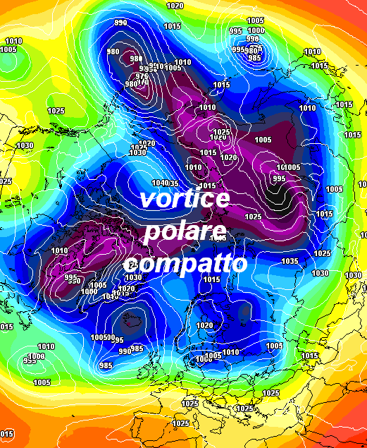 Il vortice polare è oltremodo compatto e questo impedisce la comunicazione “termica” tra il Polo e le latitudini mediterranee. Ne deriva una fase di tempo oltremodo mite che, nonostante qualche nebbia e qualche nube bassa, si trascinerà stancamente sino alla fine dell’anno. Ci si accorge di questo “stallo” osservando la carta relativa al nord emisfero per il 28 dicembre, che evidenzia un vortice polare ancora nella sua “comfort zone”, cioè avvinghiato attorno al Polo: