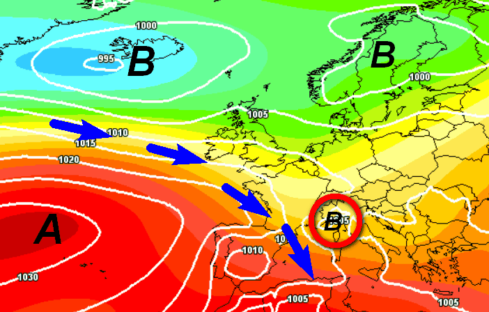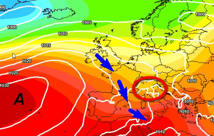 Sulla sinistra della cartina è visibile l’anticiclone delle Azzorre che tenderà gonfiarsi come un pavone, ma non riuscirà a raggiungere la nostra Penisola. L’Italia resterà quindi sotto il tiro delle correnti fresche ed instabili atlantiche con rischio di rovesci o temporali ancora elevato al nord e su parte delle regioni centrali, quantomeno le aree interne e adriatiche, in un contesto termico tutt’altro che caldo.