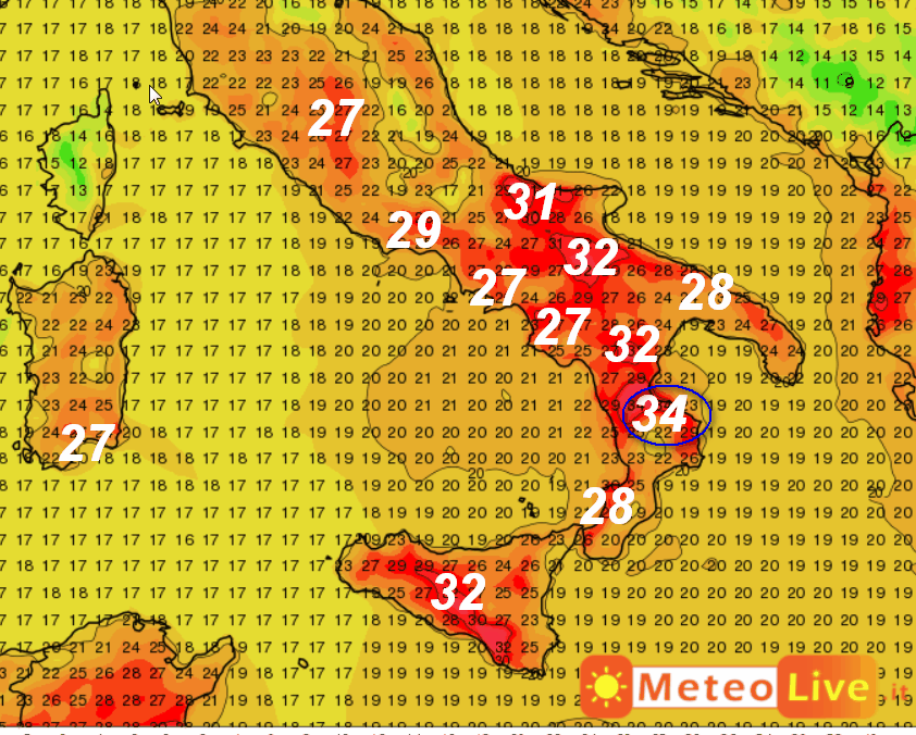 Secondo le mappe odierne, il caldo tenderà in parte e temporaneamente a ritirarsi, ma sembra pronto a tornare nella giornata di sabato (ne riparleremo). Si notano comunque valori termici superiori a 30° sulla Sicilia e la Lucania…in leggero e temporaneo calo (ma sempre oltre la media del periodo) sul restante meridione.