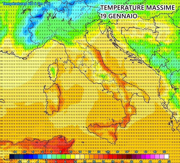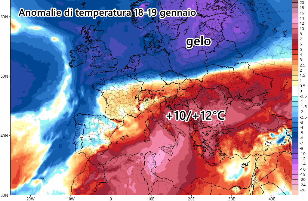 Le anomalie di temperatura previste tra 18 e 19 gennaio sono piuttosto eloquenti! Su centro e sud si temono punte di oltre 10-12°C rispetto alle medie del periodo.
