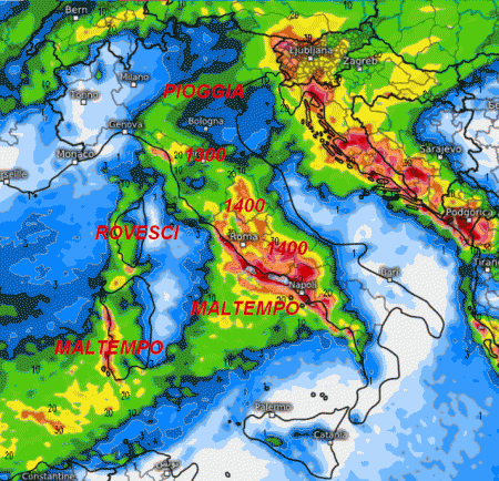 Neve abbondante sui settori confinali della Val d’Aosta sopra i 700-800 metri. Rovesci su alta Toscana, Sardegna occidentale, Lazio e Campania. Quota neve sui 1300 metri sull’Appennino settentrionale, 1400-1500 metri sulla restante chiostra montuosa appenninica. Tempo asciutto al nord.
