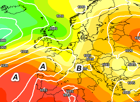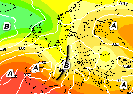 La seconda cartina mostra la situazione sinottica attesa in Italia nel medesimo giorno, ma secondo il modello europeo: