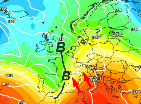 Si nota l’approccio da ovest della perturbazione con un minimo di bassa pressione nei pressi del Golfo del Leone. Davanti ad esso avremo un ventaglio di correnti meridionali umide che determineranno intense precipitazioni su alcune aree del nord.