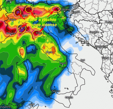 Abbiamo segnato in giallo le aree a maggior rischio nubifragi secondo le mappe odierne..e cioè: l’alto Piemonte, l’alta Lombardia, il Friuli, la Liguria centrale e l’alta Toscana. Piogge intense si avranno comunque anche nelle aree interne del Lazio.