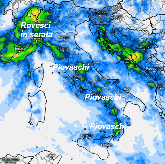 Sarà forse la giornata meno perturbata. Piovaschi saranno comunque possibili lungo il versante tirrenico e le aree interne. In serata rovesci in intensificazione al nord-ovest con neve oltre i 1300-1500 metri, per il resto tempo più asciutto e nel complesso mite.