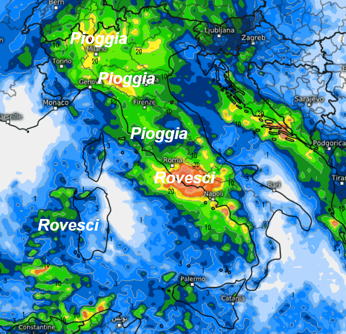 Come vedete, le aree non interessate dalle piogge saranno in netta minoranza sul nostro Paese. Rovesci intensi sono attesi tra il Lazio e la Campania, piogge moderate al nord e su quasi tutto il centro. Più irregolari le precipitazioni sulle Isole, a carattere di rovescio, ma alternate a lunghe pause asciutte. Tempo asciutto solo sulle estreme regioni meridionali e sulla Puglia. Clima mite e quote neve elevata sulle Alpi, indicativamente oltre i 1500 metri.