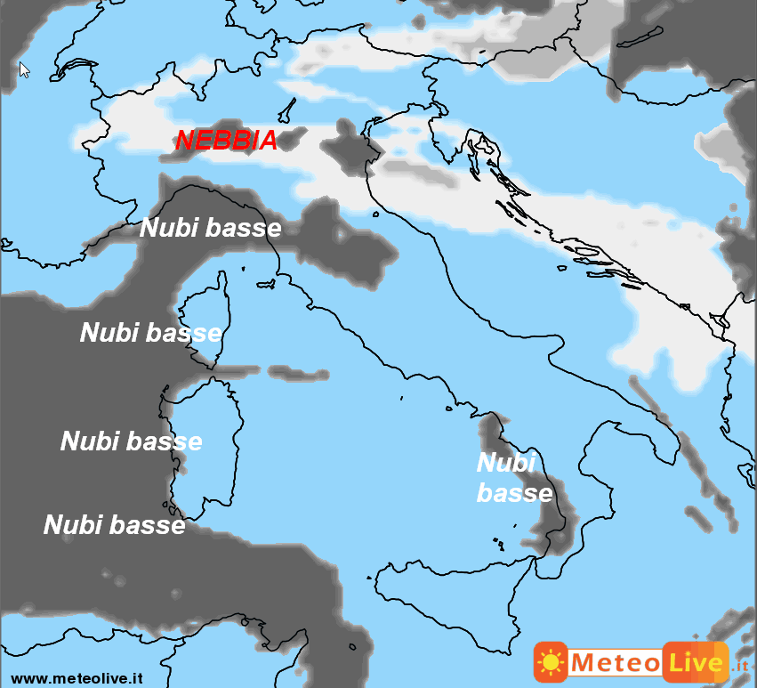 In altre parole, sui monti ed in collina sarà primavera, mentre le pianure saranno avvolte da una fitta coltre di nebbia che potrebbe persistere anche di giorno, determinando temperature alquanto basse. Poi ci saranno le nubi basse che ricopriranno alcune aree dei versanti occidentali della Penisola.