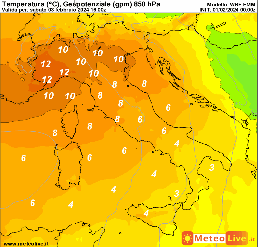 L’aumento termico alla medesima quota sarà particolarmente avvertito sul nord-ovest dove si prevedono isoterme attorno a + 12°, ma quasi tutto il nord Italia avrà temperature attorno a 10°. I valori termici a 1500 metri tenderanno a decrescere progressivamente da nord a sud fino ad un minimo di 3-4° sulle estreme regioni meridionali.