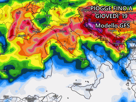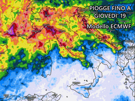 In questo contesto, sia il modello americano GFS (mappa sopra) che il modello europeo ECMWF (mappa sotto) concordano nel prevedere precipitazioni consistenti fino al prossimo giovedì, soprattutto nelle regioni centrali, con accumuli localmente superiori a 90-100 millimetri in luoghi come la Toscana, la Liguria orientale, l’Umbria e l’Emilia Romagna.