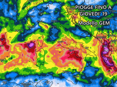 Il modello canadese Gem propone una situazione diversa, suggerendo precipitazioni più abbondanti al sud Italia, mentre altrove le precipitazioni sarebbero più scarse.