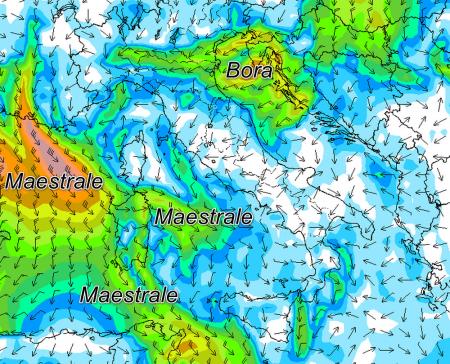 Questa perturbazione segnerà anche un declino dell’anticiclone africano sul Mediterraneo, con un ricambio d’aria previsto su quasi tutto il Paese entro l’inizio della prossima settimana, quando ci aspettiamo una riduzione dei valori termici, caldo moderato e ventilazione di Maestrale soprattutto tra domenica e lunedì sui bacini occidentali (Mar di Corsica, Mar di Sardegna e Canale di Sicilia). Sulle regioni del centro e del sud il ricambio d’aria questa volta non sarà accompagnato da fenomeni significativi, ci sarà spazio soltanto per un rinforzo del vento. Analisi dei venti al suolo previsti dal modello americano per la mattinata di lunedì 24 agosto, rinforzi di Maestrale sui bacini occidentali:
