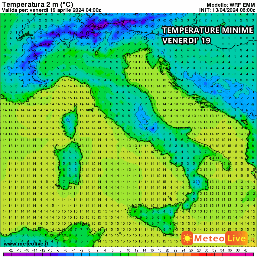 La percezione del freddo, inoltre, sarà ancor più marcata durante le ore notturne, quando la colonnina di mercurio rischia di scivolare addirittura al di sotto dei 5 °, portandosi clamorosamente al di sotto dello zero nelle Valli e nelle campagne. Questo rischio sarà più elevato sul finire dell’ondata di freddo, soprattutto tra il 18 e il 20 Aprile. Nella mappa seguente possiamo osservare le temperature minime indicative previste nella notte di venerdì 19 Aprile.