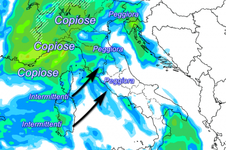 Il passaggio di una prima perturbazione organizzata viene bene inquadrato dai modelli a cavallo tra domenica 31 ottobre e lunedì primo novembre, con precipitazioni che colpiranno domenica special modo l’angolo nord-occidentale, con piogge copiose su Valle d’Aosta, Lombardia, Piemonte e Liguria. Tra domenica sera e la mattinata di lunedì i fenomeni progrediranno verso il Triveneto, la Toscana, l’Umbria il Lazio e la Campania. Stima delle precipitazioni previste dal modello americano per lunedì 1 mattina: