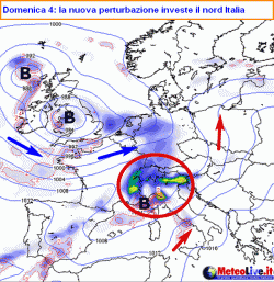 Sabato ecco invece le frange nuvolose di una nuova perturbazione sporcare i cieli del nostro centro-nord. Questa darà il meglio di sè nella giornata di domenica al nord e sulla Toscana, con precipitazioni diffuse, anche forti a ridosso della fascia prealpina (vedi figura qui a fianco). Il resto lo dedicherà ancora al centro e al sud nella giornata di lunedì, con un’ulteriore passata di rovesci.