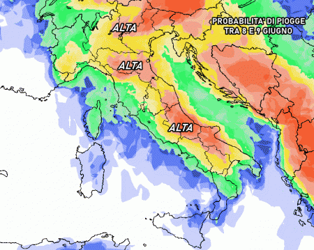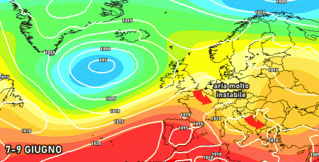 L’ingresso di una massa d’aria più fresca e instabile potrebbe generare una serie di forti temporali dapprima al nord (tra 6 e 7 giugno) e successivamente al centro e al sud (tra 7 e 9 giugno). La prossima potrebbe, pertanto, una settimana estremamente instabile e caratterizzata da numerosi acquazzoni e temporali sparsi da nord a sud.