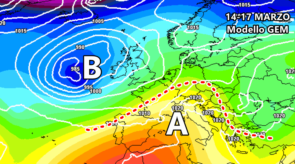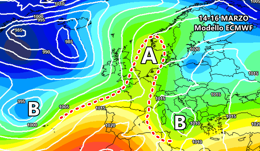 Ed ecco che passiamo all’ipotesi opposta, quella sul proseguimento del maltempo. Ci pensa l’europeo ECMWF con una nuova perturbazione nel corso della prossima settimana, precisamente tra 14 e 16 marzo. Questa nuova depressione porterebbe piogge prima al nord e poi soprattutto su centro e sud, mentre l’anticiclone preferirà settori come Francia, Germania e Norvegia.