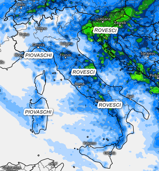Rovesci sparsi ed irregolari interesseranno gran parte delle nostre regioni, anche con qualche colpo di tuono. Le aree che vedranno la situazione meteo più compromessa saranno le regioni centrali, il basso Tirreno, la Sardegna ed i settori più meridionali del nord, oltre all’estremo nord-est. Quota neve attorno a 1200-1300 metri in Appennino, 800-1000 metri sulle Alpi. Temperature nel complesso fresche.