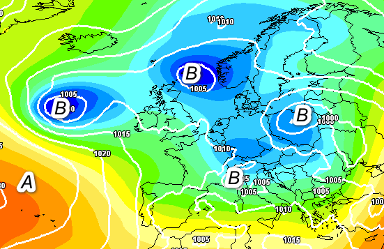 Dicevamo dell’alta pressione, che come vedete resterà di quinta sul vicino Atlantico senza intervenire sull’Italia e sul Mediterraneo. Da noi vigerà un regime complessivamente depressionario con diversi minimi tra cui uno centrato grossomodo sul Golfo Ligure. Con una situazione siffatta, il tempo non potrà assolutamente essere buono in Italia, anche se qualche spazio soleggiato non mancherà, in un contesto climatico variabile/instabile.