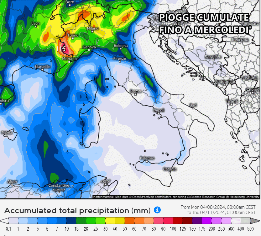 Nel frattempo il cuore di questa bassa pressione si muoverà verso sud fino a raggiungere la Corsica e la Sardegna, con piogge che continueranno a bagnare le regioni del nord, in particolar modo i settori pedemontani del nord-ovest dove ci aspettiamo gli accumuli più abbondanti. In effetti, analizzando le precipitazioni totali previste durante questo peggioramento, spuntano picchi di pioggia superiori ai 100 mm sul Piemonte occidentale. Si tratterà di neve per le alte quote delle Alpi occidentali al di sopra dei 1200-1400 m.