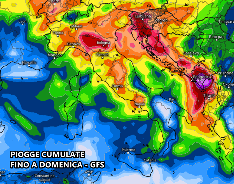 Il modello americano GFS mostra accumuli totali (fino a domenica) molto elevati in Emilia Romagna, anche oltre 150-200 mm. Accumuli importanti anche sul resto del nord e il centro Italia, con picchi di oltre 70-80 mm.