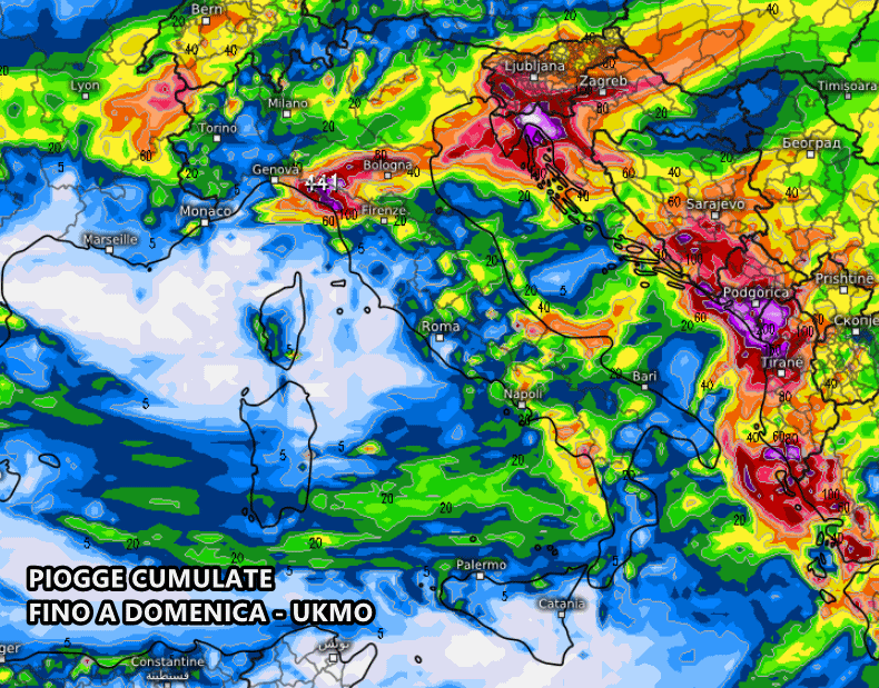 Il modello inglese UKMO, invece, mostra una concentrazione esagerata di piogge sulla Liguria orientale, l’alta Toscana e l’Appennino emiliano, con picchi locali di oltre 400 mm. Flussi umidi e instabili anche al sud Italia, con tanti temporali e accumuli localmente superiori ai 60-80 mm.
