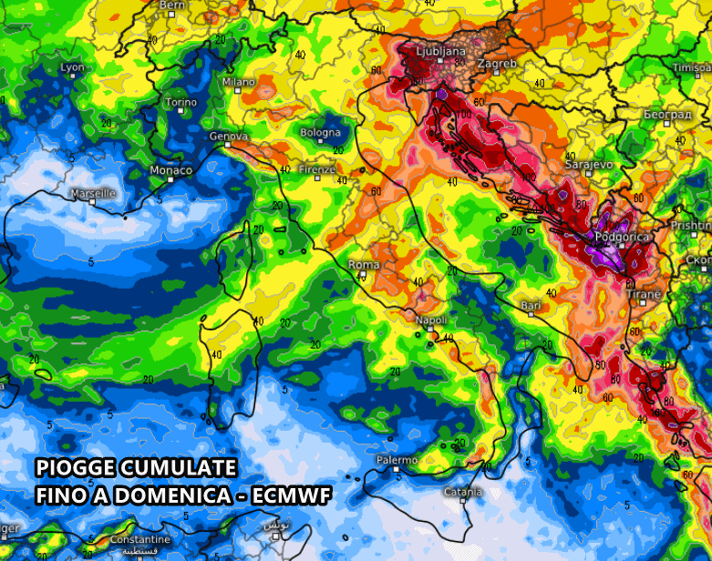 Il collega europeo ECMWF mostra uno scenario quasi diametralmente opposto per l’Emilia Romagna, specie l’area tra bolognese e ferrarese, dove gli accumuli di pioggia totali potrebbero essere nettamente inferiori rispetto alle stime del modello americano. Piogge molto abbondanti, invece, per il Friuli Venezia Giulia, anche oltre 150 mm. Piogge ben presenti su tutto il centro Italia e gran parte del sud.