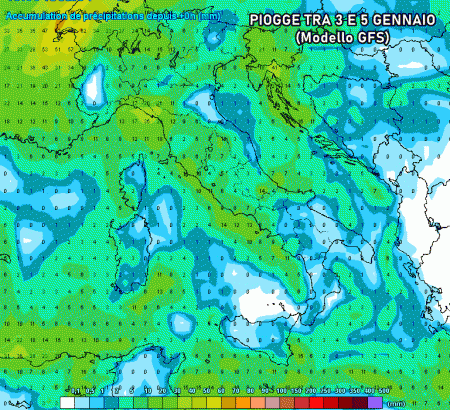 Il periodo di riferimento è quello tra 3 e 5 gennaio, momento in cui potrebbe inserirsi nel Mediterraneo centrale una perturbazione atlantica in rapido scorrimento da ovest verso est. Nulla di statico, nulla di particolarmente violento, bensì piogge sparse a tratti modeste che potrebbero bagnare dapprima il nord e a seguire anche le regioni tirreniche del centro e del sud.