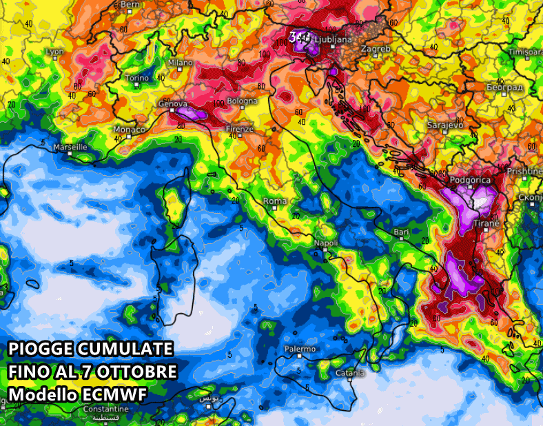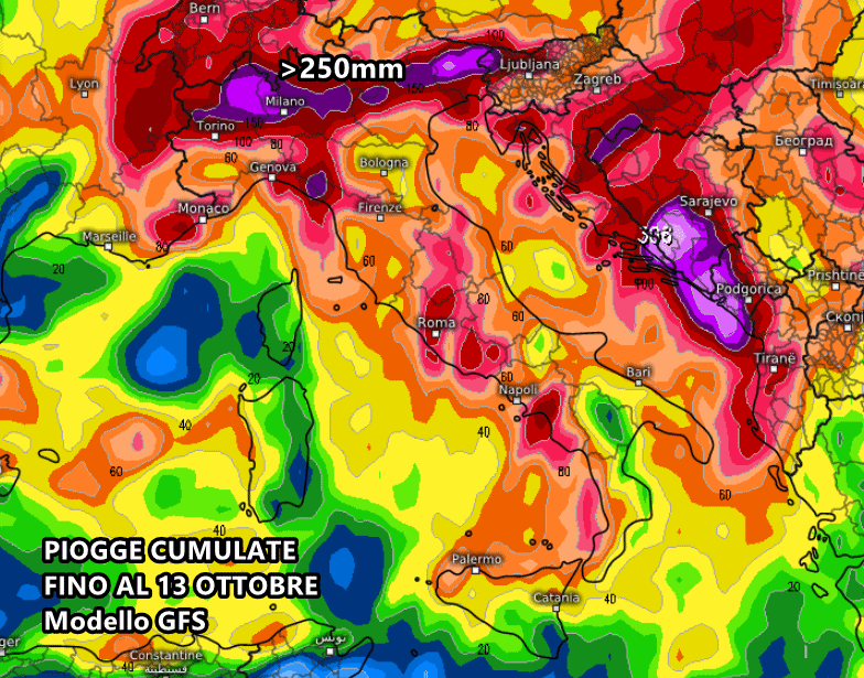 Spingendo lo sguardo più in là, fino al 13 Ottobre (come mostrato dal modello americano GFS) le piogge diventano ancor più abbondanti. La somma delle piogge generate dalle due perturbazioni previste, potrebbe generare accumuli davvero sostanziosi su tutto il nord, con picchi di oltre 250 mm. Tanta pioggia anche sul centro-sud, generalmente tra i 50 e i 150 mm: