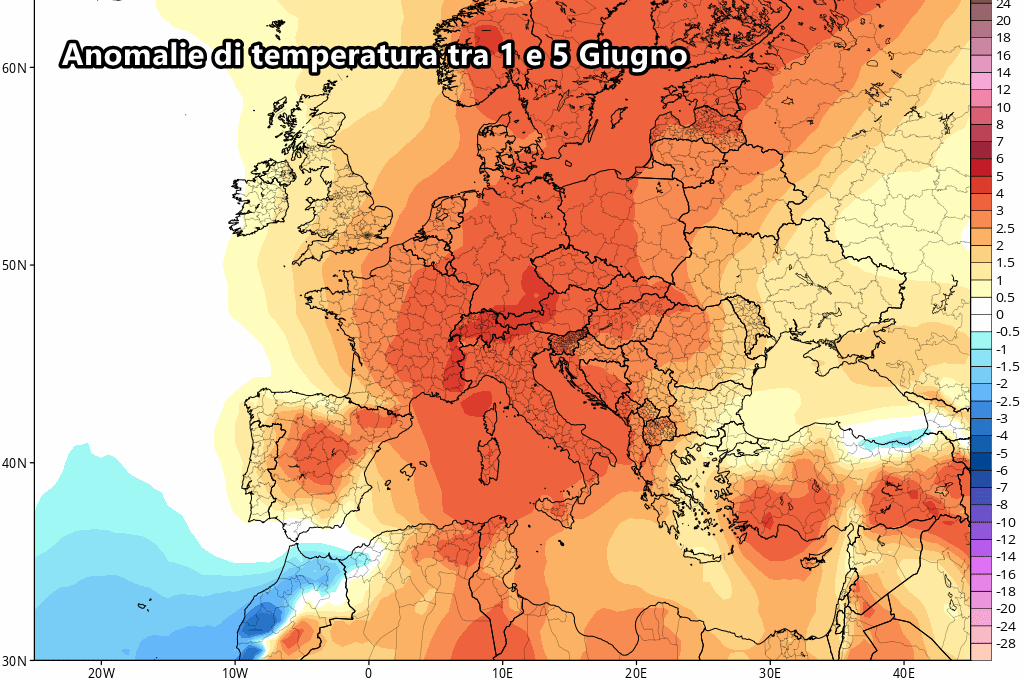 Difatti il contesto termico previsto nei primi 5 giorni di Giugno mostra un generale sopra-media, dovuto all’intrusione di aria più calda africana verso l’Italia. Questo caldo, tuttavia, rischia di rivelarsi determinante per la formazione dei forti temporali al nord.