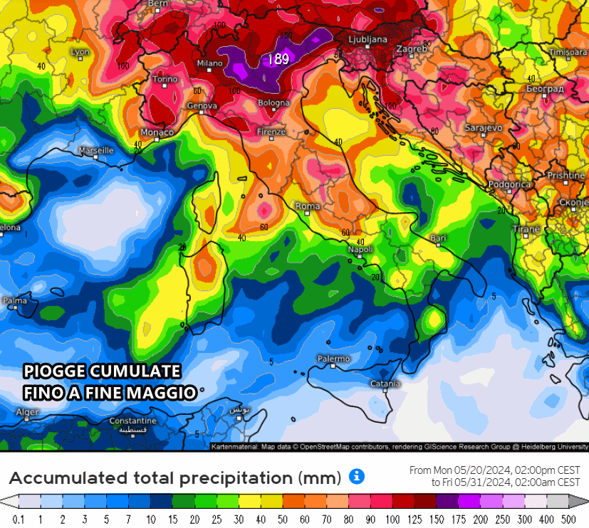Secondo gli ultimi aggiornamenti nei modelli matematici, le perturbazioni rischiano di farci compagnia almeno fino al termine di maggio. Mancherà un vero e proprio anticiclone solido e duraturo e pertanto dovremo inevitabilmente fare i conti con flussi instabili e più freschi provenienti da ovest, che daranno luogo a acquazzoni e temporali a più riprese soprattutto sulle regioni del Nord. Addirittura, da qui al termine di maggio sono previsti accumuli di pioggia oltre i 150 mm su molte località del settentrione, i quali andranno a sommarsi a tutta la pioggia già caduta nelle ultime settimane.