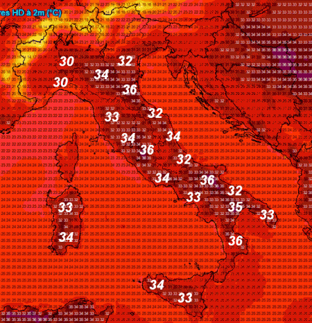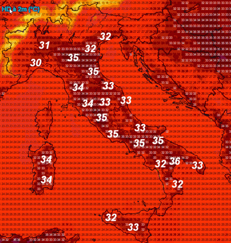 Non ci sono molti commenti da fare a questa mappa, che potrebbe tranquillamente appartenere ad una normale giornata di metà luglio. Punte di 34-35° diffusi da nord a sud, addirittura 36° sulla bassa Lucania.
