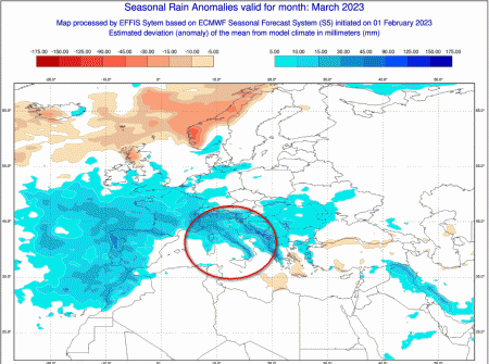 La prima mappa mostra l’anomalia precipitativa attesa nell’arco del mese di marzo su tutta Europa: