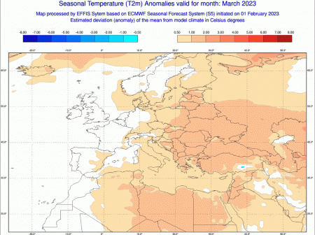 Come si comporterà invece marzo dal punto di vista termico? Ecco la mappa delle anomalie di temperatura sempre secondo il centro di calcolo ECMWF: