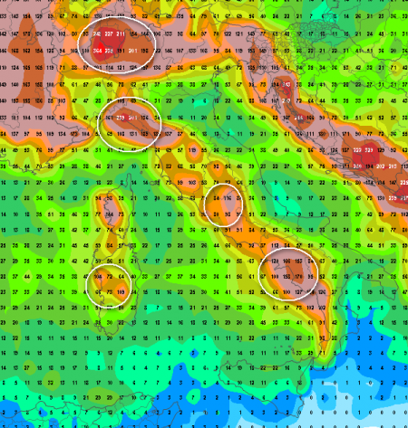 Chi offre di più allora entro il 29 ottobre? Il modello americano è il più generoso in termini di accumuli, come vediamo qui sotto, con picchi dai 180 a 360mm, davvero niente male, anzi situazione delicata per alcune zone come lo Spezzino, la Lunigiana, la Garfagnana, il Lago Maggiore, l’alto Friuli, ma anche il Lazio interno e il Cilento, persino 111mm sono attesi nell’Oristanese in Sardegna: