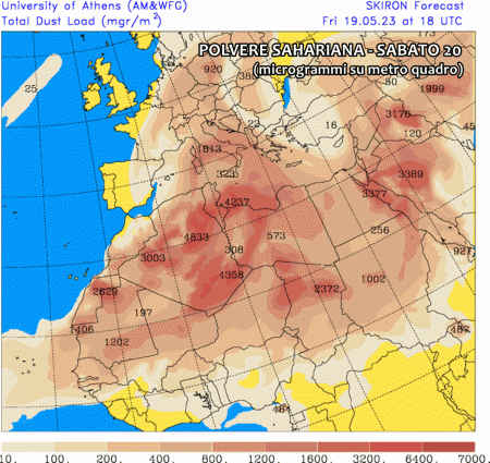 La polvere desertica si diffonderà entro domani su tutta Italia, restando in sospensione in alta quota per molti giorni consecutivi. Le concentrazioni maggiori, tuttavia, sono previste nel corso di sabato 20 Maggio quando si prevedono picchi di oltre 1000 microgrammi su metro quadrato al centro-sud. Considerando che ci troveremo nel pieno del maltempo, è chiaro che questa sabbia precipiterà al suolo assieme alla pioggia.