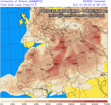 Domenica 21 Maggio avremo cieli pregni di polvere da nord a sud, ma con concentrazioni più elevate in Sicilia. Questa polvere precipiterà al suolo in presenza di piogge e temporali, sporcando ogni genere di superficie.
