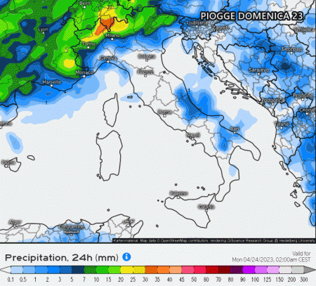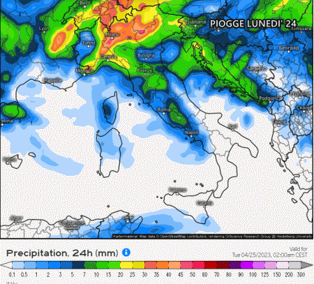 LUNEDI’ 24 – Corposo peggioramento su tutto il nord. In arrivo una saccatura fredda nord-atlantica foriera di temporali e locali forti grandinate. Temporali più intensi su Lombardia, Liguria, Trentino con accumuli abbondanti. Maltempo in estensione al centro Italia. Più stabile, momentaneamente, al sud.