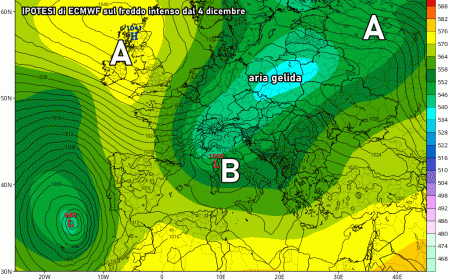 Che il freddo prenda la via dell’Italia rientra tra le possibilità, come evidenziato dalla simulazione odierna del modello ECMWF, che pone il centro-nord Italia sotto un flusso molto freddo e ricco di neve tra 4 e 5 dicembre. Ovviamente ribadiamo che si tratta solo di una di tante ipotesi, come ovvio che sia a così tanti giorni di distanza e soprattutto in presenza di retrogressioni fredde da est.